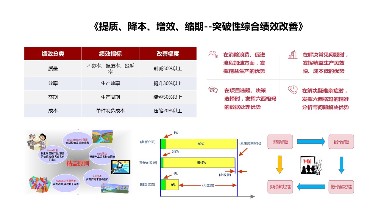 东亨咨询《提质、增效、降本、缩期-突破性综合绩效改善》系列课程,运用精益六西格玛手法可使质量、效率、成本、交期有突破性的改善。