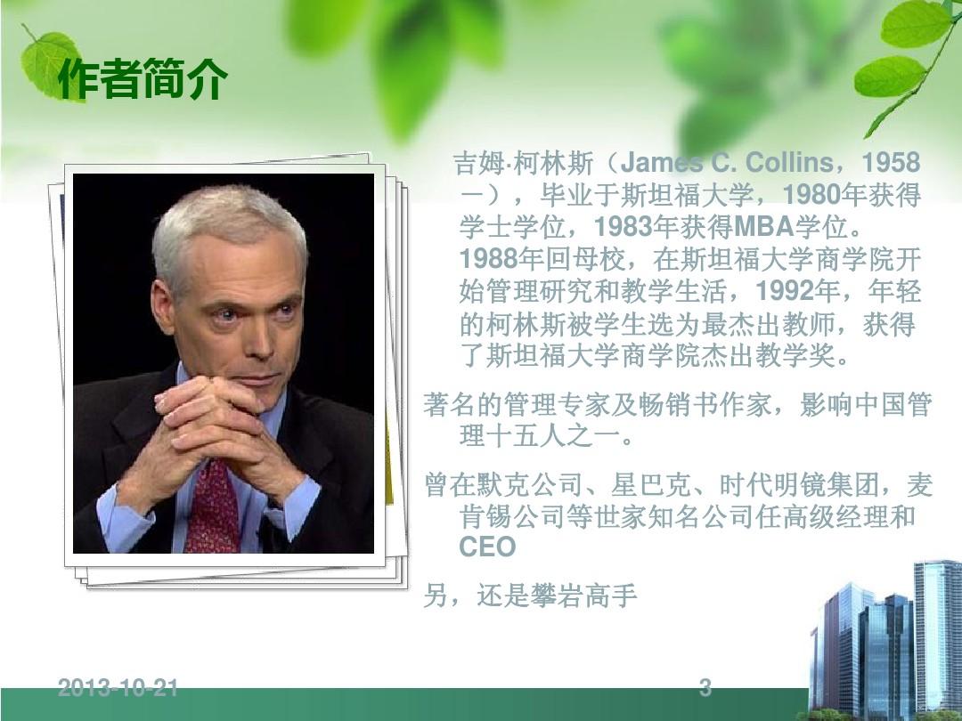 詹姆斯•柯林斯曾获斯坦福大学商学院杰出教学奖,先后任职于麦肯锡公司和惠普公司。与杰里•I•波勒斯合著了《基业长青》一书,在《基业长青》一书中,詹姆斯•柯林斯和杰里•I•波勒斯一道,研究了18家卓越非凡、长盛不衰的公司。并将这些公司直接与他们的一个突出的竞争对手进行对照,总结了这些公司为什么长盛不衰的奥秘。书中提出了他的主要管理思想。