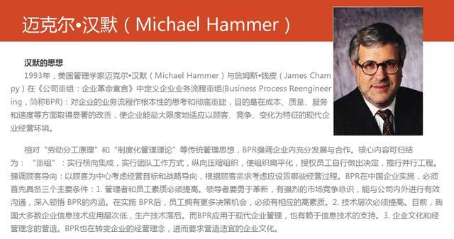 1993年,美国管理学家迈克尔•汉默与詹姆斯•钱皮在《公司重组:企业革命宣言》中定义企业业务流程重组(Business Process Reengineering,简称BPR):对企业的业务流程作根本性的思考和彻底重建,目的是在成本、质量、服务和速度等方面取得显著的改善,是企业能最大限度地适应以顾客、竞争、变化为特征地现代企业经营环境。