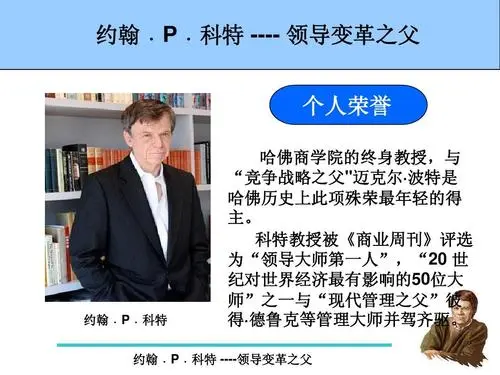 约翰•科特是世界领导与变革领域的权威,哈佛商学院终身教授。在2001年10月出版的《商业周刊》对504位企业负责人的问卷调查中,科特教授被选为“领导大师第一人”。科特最重要的思想有下列两项: